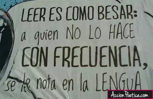 Leer es como besar: a quien no lo hace con frecuencia, se le nota en la lengua Posted on 2 diciembre, 2014 by Administrador Fotos relacionadas Leer da sueños Te quiero como eres, pero no me digas como eres El que no tiene memoria se hace una de papel Pensar Querer Besar (TE) Te quiero no por quién eres sino por quien soy cuando estoy contigo